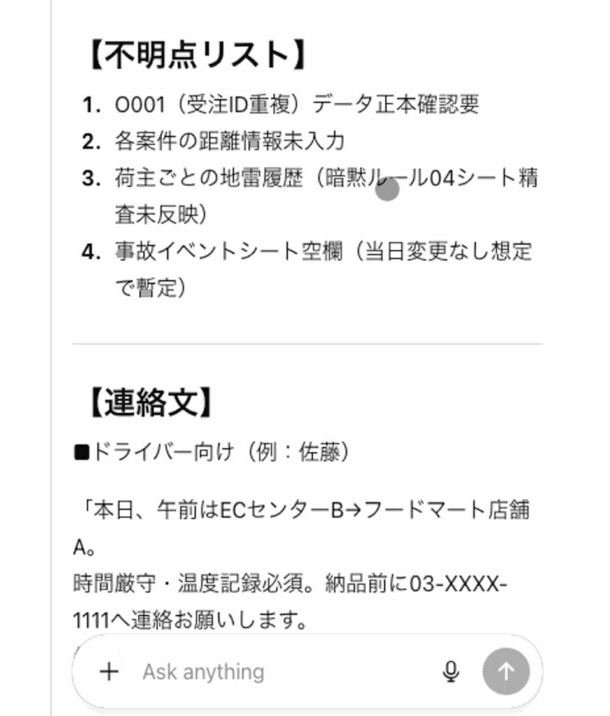 配車マンの時間を奪う「電話・メール地獄」も終了。 ドライバーへの指示出し、荷主への遅延連絡……AIが失礼のない文章を勝手に作ります。あなたはコピペして送るだけ。