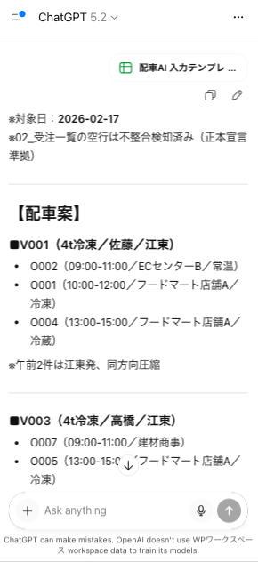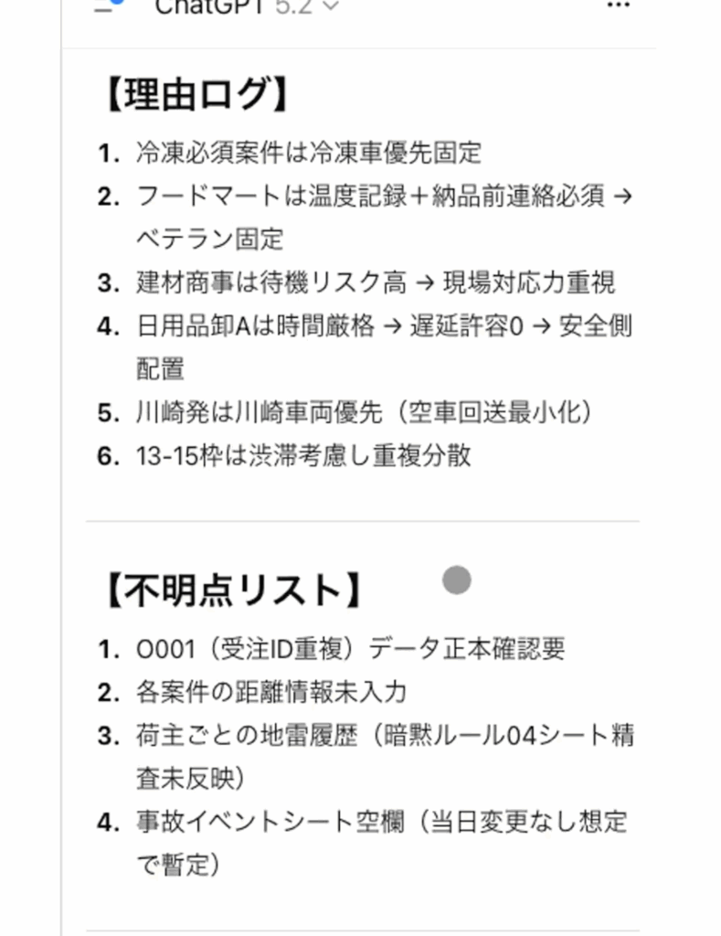 「なぜそのルート?」AIが理由をすべて言語化します。 AI任せにはしません。なぜそう組んだのか、AIが「理由」を答えるから、最終チェックをする社長も安心。ブラックボックス化を防ぎ、ノウハウが社内に蓄積されます。